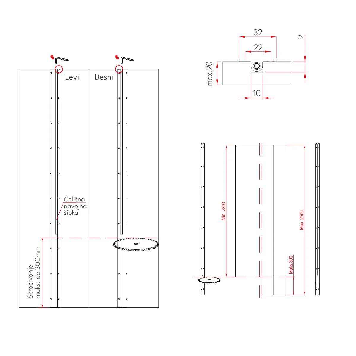 ZAT 211 španer/zatezač za plakarska vrata Zatezač vrata dužine 2500mm, namenjen za vrata debljine najviše 20mm. Za jedna vrata koriste se dva zatezača paralelno postavljena po vertikali. Kod vrata koja su šira od 1200mm, trebalo bi dodati treći zatezač. Aluminijumski poklopac može se skratiti najviše 300mm u donjem delu zatezača. Zatezač se podešava u gornjem delu vrata uz pomoć imbus ključa 4mm. Zatezač TS 321 može se postaviti na vrata maksimalne visine 2800mm, a minimalne visine 2200mm. * Cena se odnosi na par zatezača.