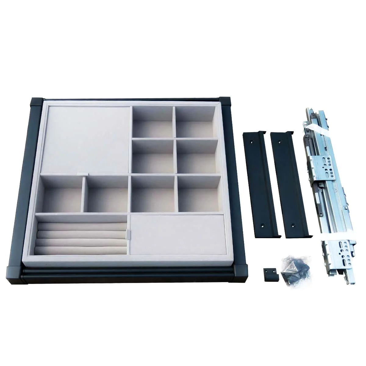 UP fioka za organizovanje nakita Širina korpusa može da se podešava od 56cm do 61,8cm. Dužina: 48,5cm Visina: 8cm Set sadrži i klizač sa usporivačem. Boja: antracit.