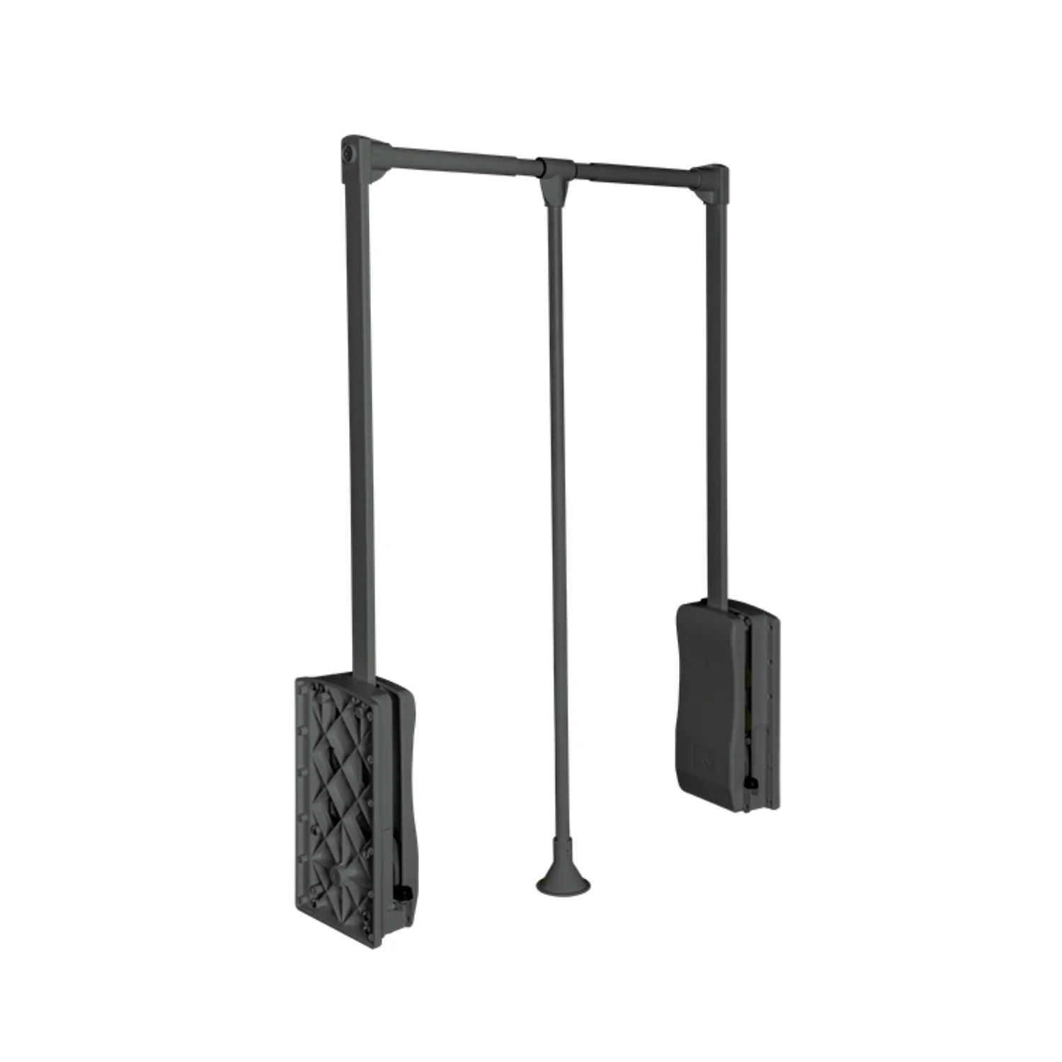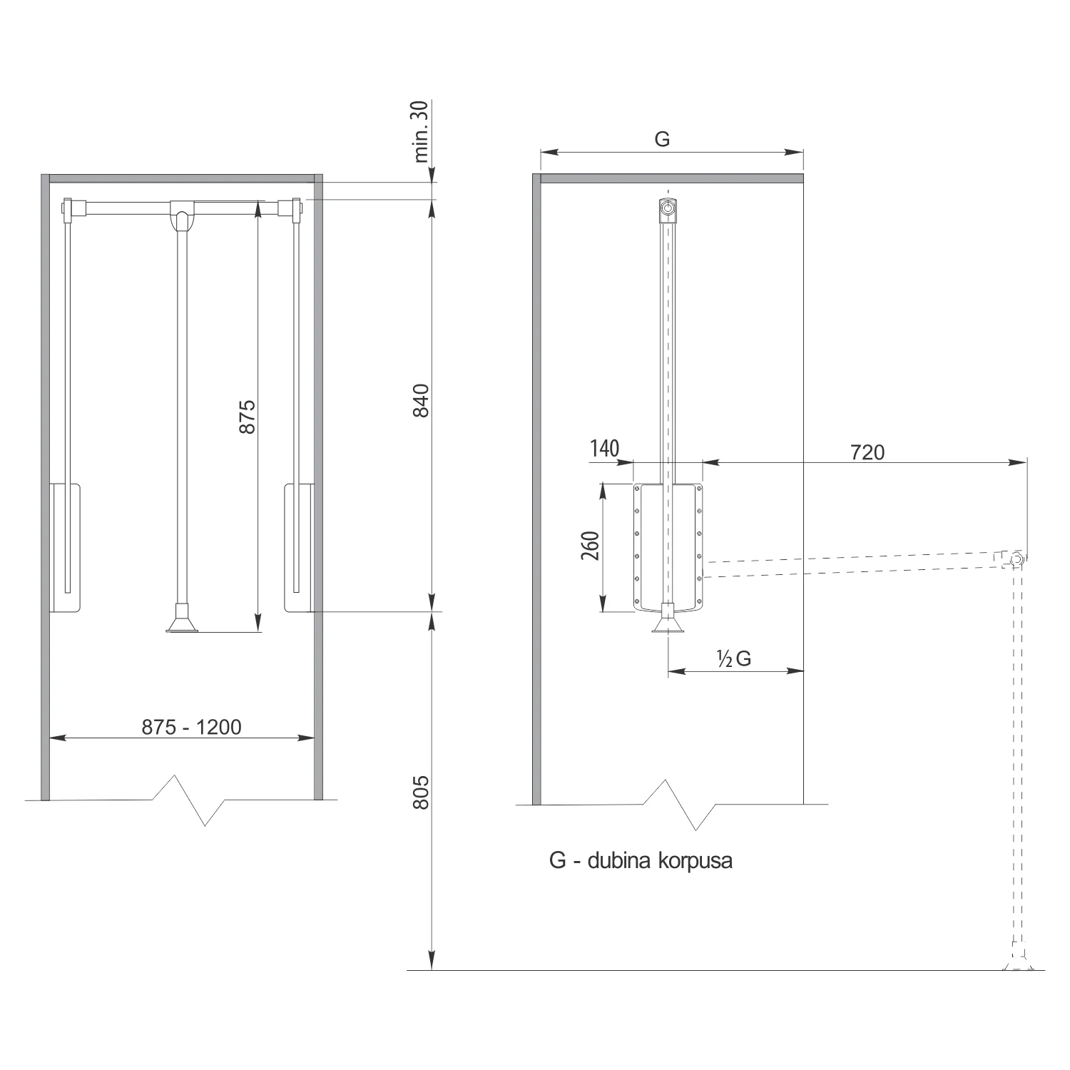 Lifter za garderobu - 87,5 do 120cm Lifter se postavlja u korpuse unutrašnjih dimenzija od 87,5cm do 120cm maksimalne širine. Maksimalna nosivost je do 8 kilograma. Boja: Antracit siva Materijali: Aluminijum, čelik i plastika