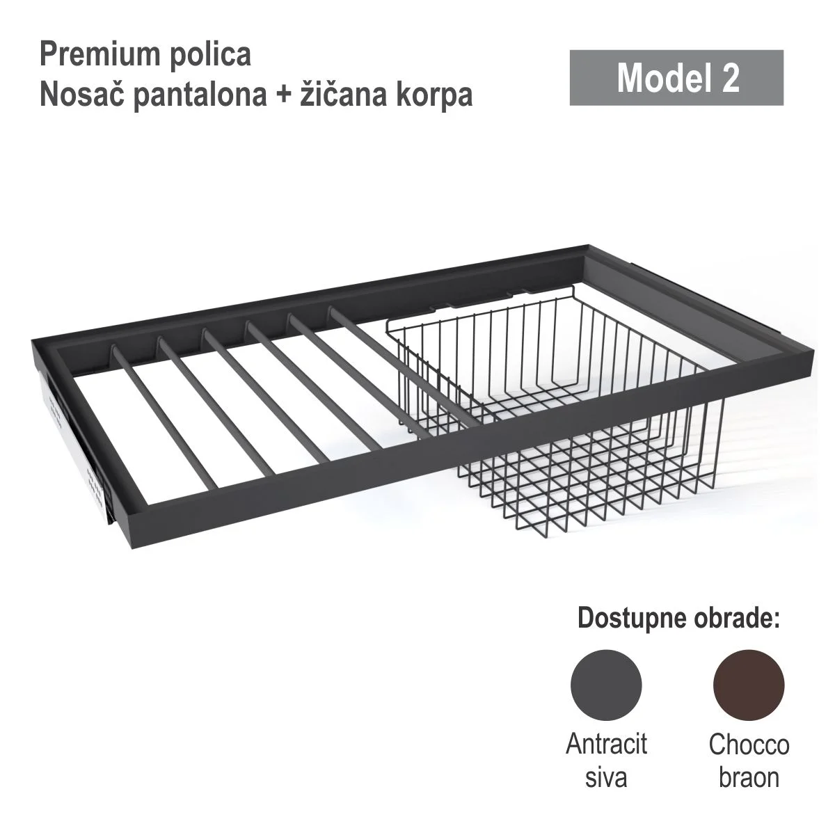 UP Premium nosač pantalona - Model 2 Premium polica se radi na meru a namenjena je za korpuse širine od 496-946mm i dubine min. 500mm. Polica/pantaloner je dostupan u dve završne obrade, antracit sivoj i čoko braon boji. Za izradu police se koriste skriveni klizači sa integrisanim usporivačima, profili za izradu police, uglovi, držači reilinga, reilinzi i žičane korpe u odgovarajućoj boji. Žičane korpe su dostupne u sledećim dužinama: 390, 590, 690 i 790mm širine. Širina korpe koja se montira u samu policu odrađuje koliko prostora ostaje za nosače pantalona. U gornjoj zoni reilinga se postavlja protivklizna guma koja sprečava neželjeno pomeranje pantalona prilikom otvaranja/ zatvaranja fioke. Klizači se potpuno otvaraju, što daje maksimalno iskorišćenje prostora i police. Detalje vezane za rok izrade kao i cenu police možete dobiti slanjem upita na: office@europrofil.rs .