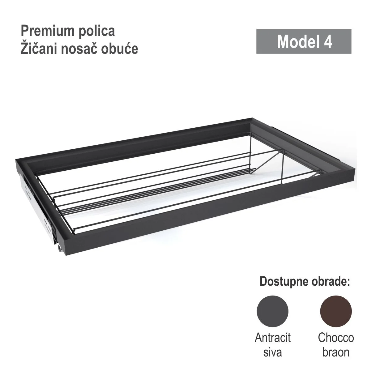 UP Premium polica / cipelarnik - Model 4 Premium polica se radi na meru a namenjena je za korpuse sledećih širina: 668, 768 i 868mm i dubine min. 500mm. Polica za obuću je dostupna u dve završne obrade, antracit sivoj i čoko braon boji. Za izradu police se koriste skriveni klizači sa integrisanim usporivačima, profili za izradu police, uglovi kao i jedna od sledećih širina žičanog nosača obuće: 596, 698 i 868mm. Klizači se potpuno otvaraju, što daje maksimalno iskorišćenje prostora i police. Detalje vezane za rok izrade kao i cenu police možete dobiti slanjem upita na: office@europrofil.rs .