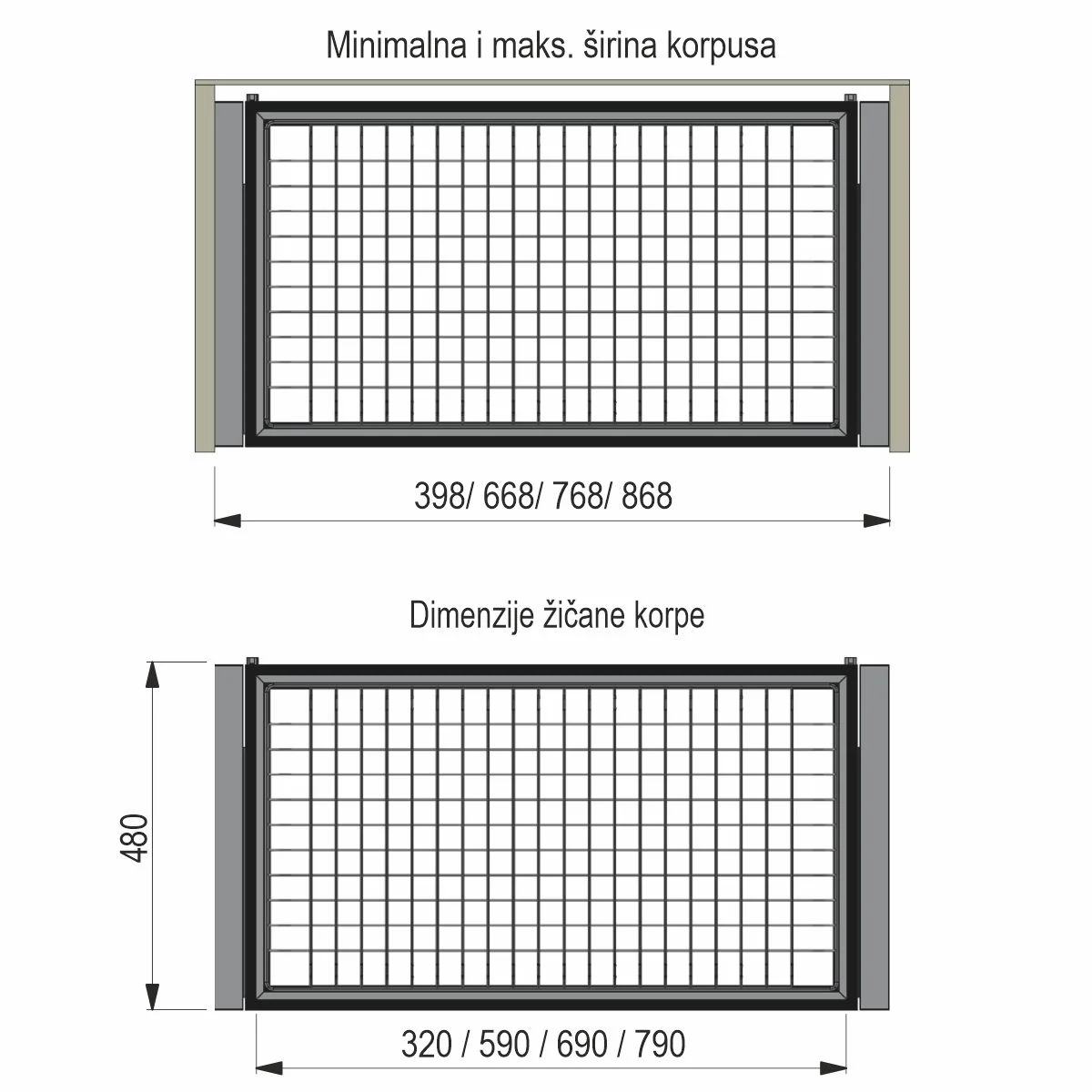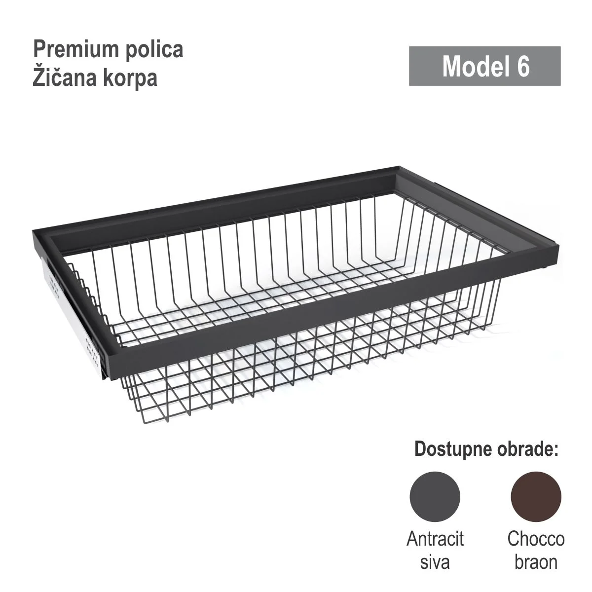 UP Premium polica sa žičanom koprom - Model 6 Premium polica se radi na meru a namenjena je za korpuse sledećih širina: 398, 668, 768 i 868mm i dubine min. 500mm. Polica sa korpom je dostupna u dve završne obrade, antracit sivoj i čoko braon boji. Za izradu police se koriste skriveni klizači sa integrisanim usporivačima, profili za izradu police, uglovi, držači reilinga, reilinzi i žičane korpe u odgovarajućoj boji. Žičane korpe su dostupne u sledećim dužinama: 326, 596, 696 i 796mm širine. Klizači se potpuno otvaraju što daje maksimalno iskorišćenje prostora i police. Detalje vezane za rok izrade kao i cenu police možete dobiti slanjem upita na: office@europrofil.rs .