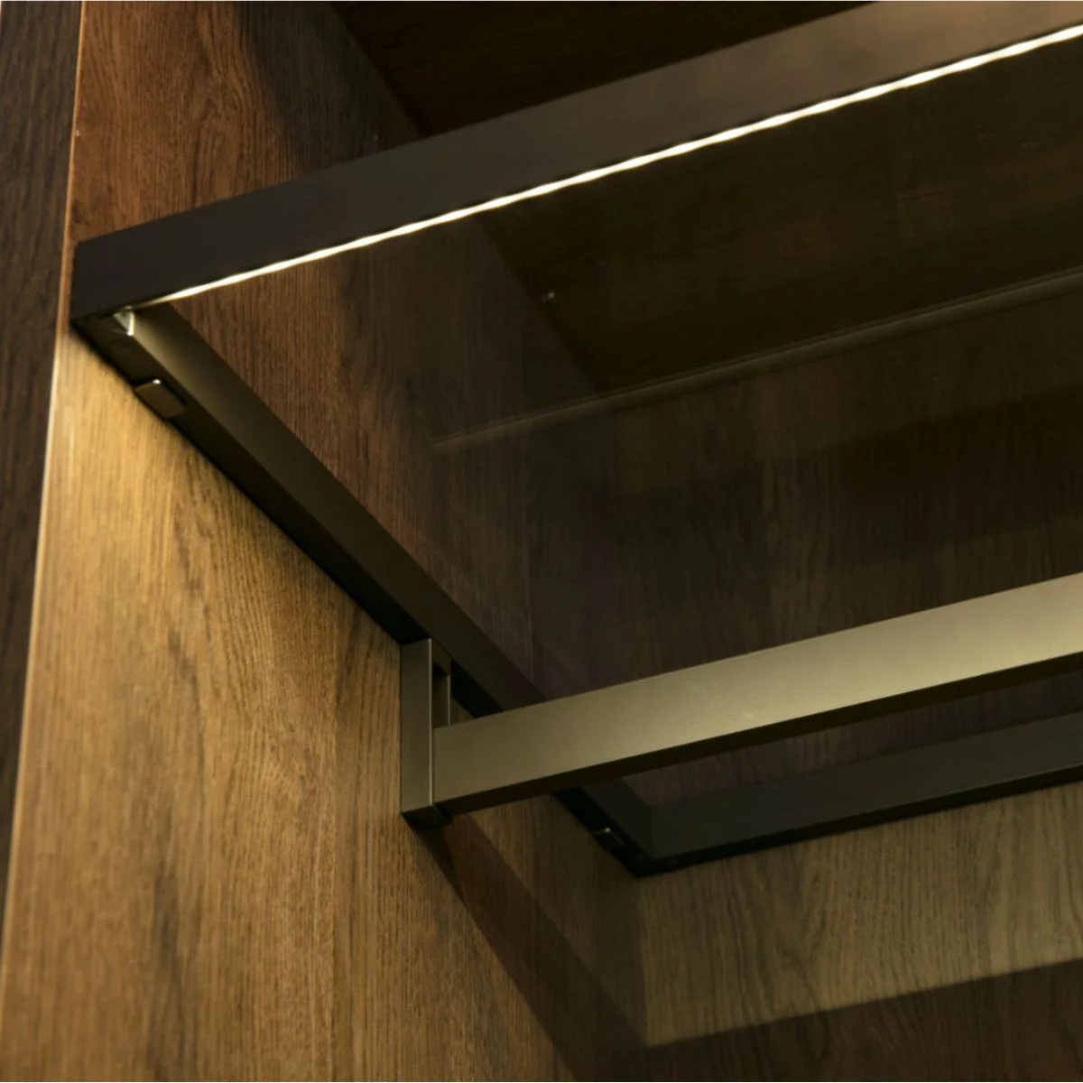 Staklena polica za unutrašnjost plakara 664x530mm Polica je izrađena od aluminijumskih profila koji u sebi imaju integrisan kanal u koji je postavljena LED traka koja usmerava svetlost ka unurašnjosti plakara. Dolazi sa integrisanom garderobnom šipkom u istoj završnoj obradi. Ispuna je providno staklo 4mm debljine. Polica je namnjena za korpus širine 664mm i dubine min. 530mm. Može se postavljati u garberobere sa kliznim vratima, kao i u otvorene Walk In sisteme za otvorene garderobere.