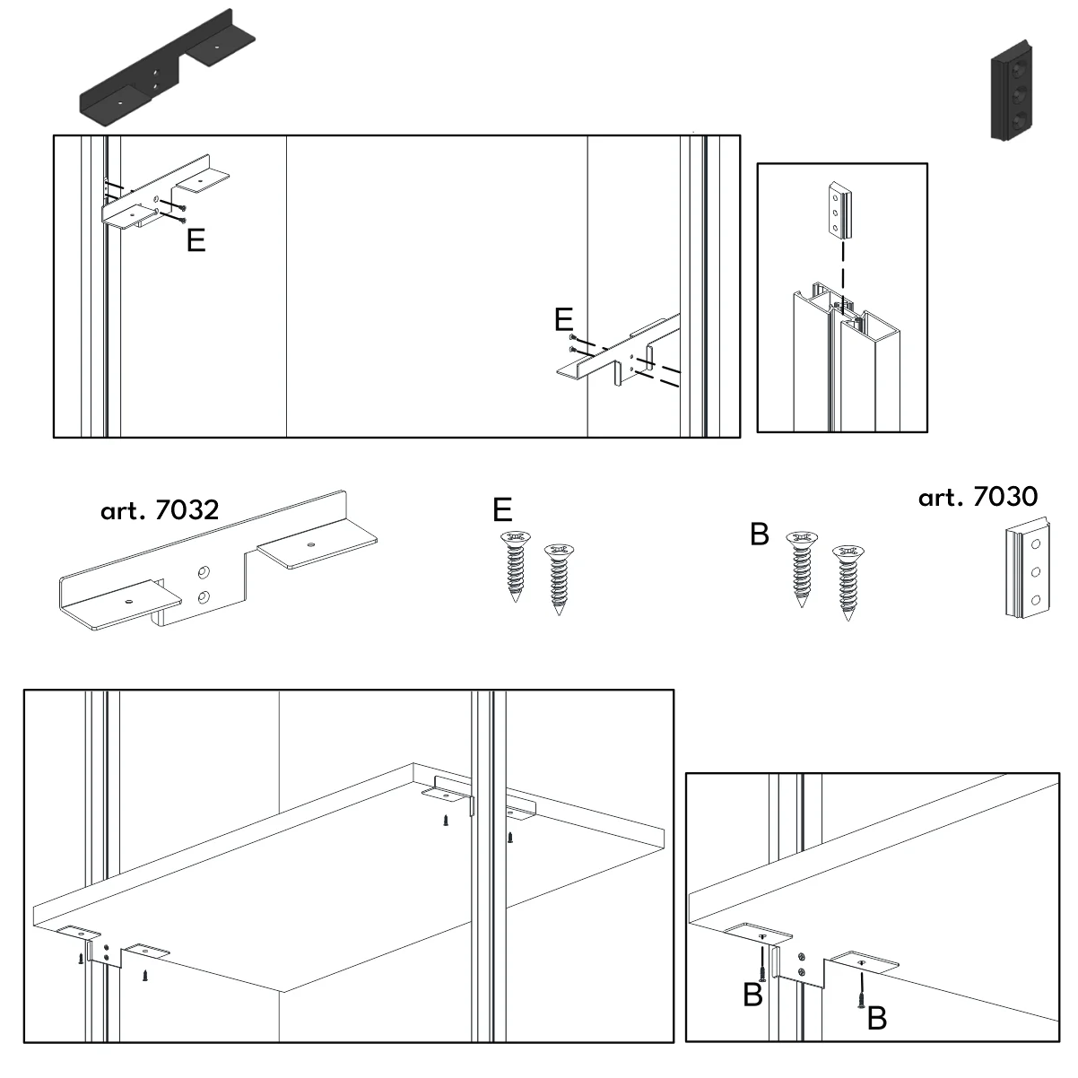 Metalni nosač drvene police Koristi se za montažu drvene police na vertikalne profile za izradu otvorenih garderobera (art. 6723). Vezuje se za vertikalni profil uz pomoć podloške (art. 7030). Materijal: metal Završna obrada: antracit siva