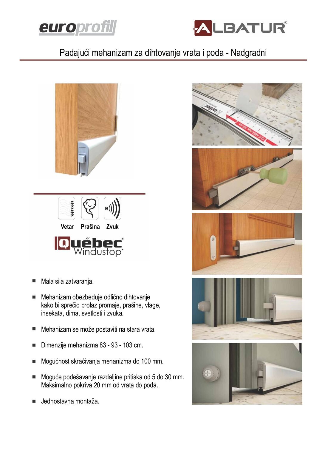 Padajući diht mehanizam za vrata 103cm - Nadgradni Padajući mehanizam se postavlja na vrata i omogućava dihtovanje, koje sprečava prolaz: promaje, prašine, vlage, insekata, dima, svetlosti i zvuka. Mehanizam se može postaviti na već postojeća (stara) vrata. Maskimalno pokriva razmak od 20mm između poda i donje strane vrata, mehanizam se može skratiti maksimalno 100mm. Podešavanje razdaljine pritiska od 5 do 30mm. Dužina mehanizma: 103cm *Cena se odnosi na komad