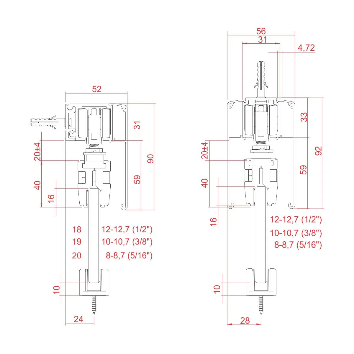 Vetro 40 nosač stakla - 10mm Nosač stakla se koristi prilikom izrade staklenih kliznih vrata sa Vetro 40 kliznim sistemom. Uz Vetro 40 nosač stakla, takođe se koristi i Vetro 40 metalni mehanizam. U setu se nalaze, dva kom. Al profila (nosači stakla) u dužinama od 1000mm, 20 kom. PVC umetaka koji se postavljaju izmedju samih nosača i stakene ispune (debljine 10mm), 20 vijaka sa maticom koji služe da međusobno povežu nosače u kojima se nalazi staklena ispuna i dva PVC čepa koji se postavljaju bočno na krajeve nosača stakla. Za montiranje Vetro 40 nosača stakla nije potrebno prethodno bušenje staklene ispune. Napomena: Za montažu klampi je potreban i kilo ključ obzirom da sila stezanja vijaka ne sme da prelazi 15Nm, da ne bi došlo do pucanja stakla.