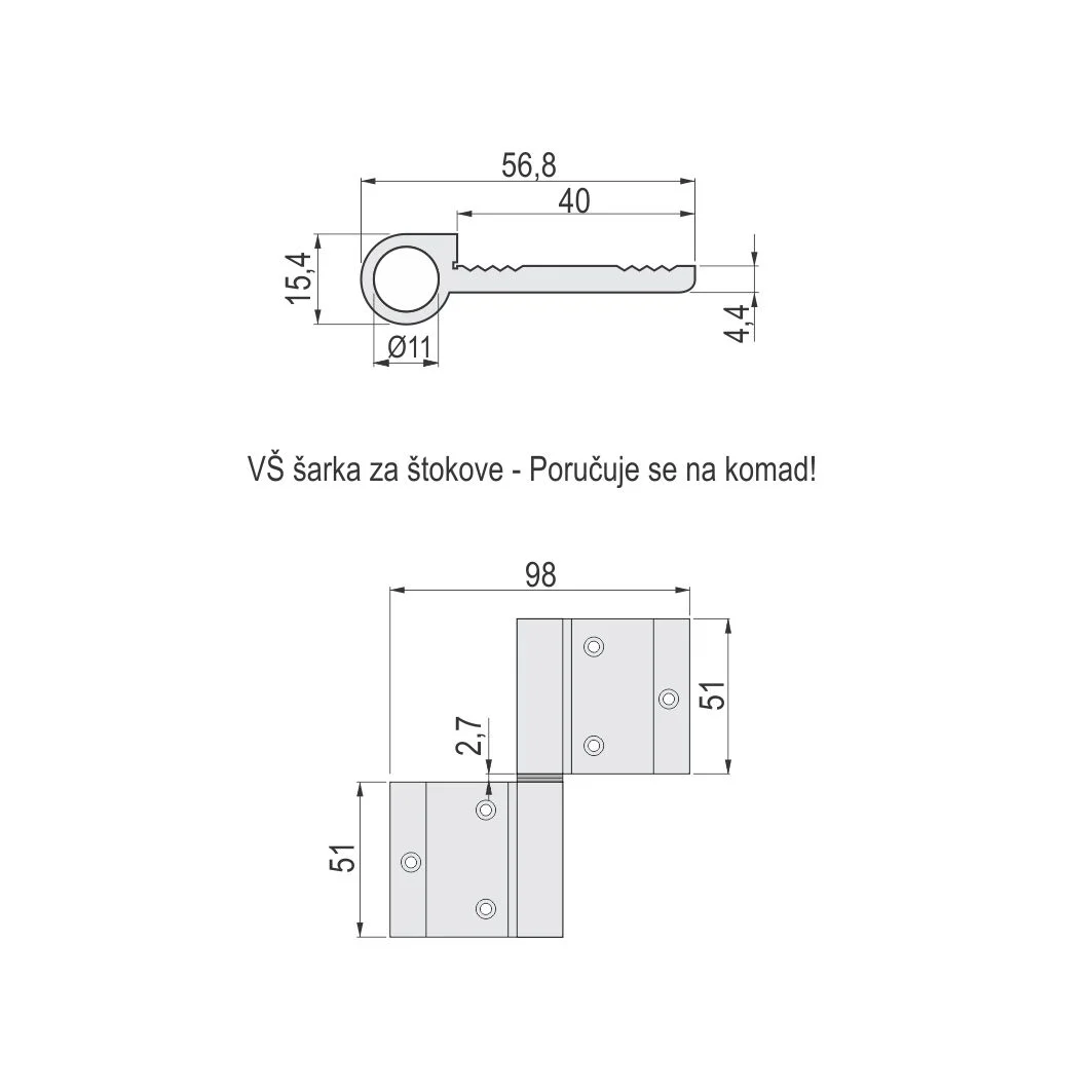 Aluminijumska šarka za vrata Al štoka. Al šarka se koristi kod izrade drvenih ili staklenih vrata. VŠ Šarka za štok prodaje se na komad.
