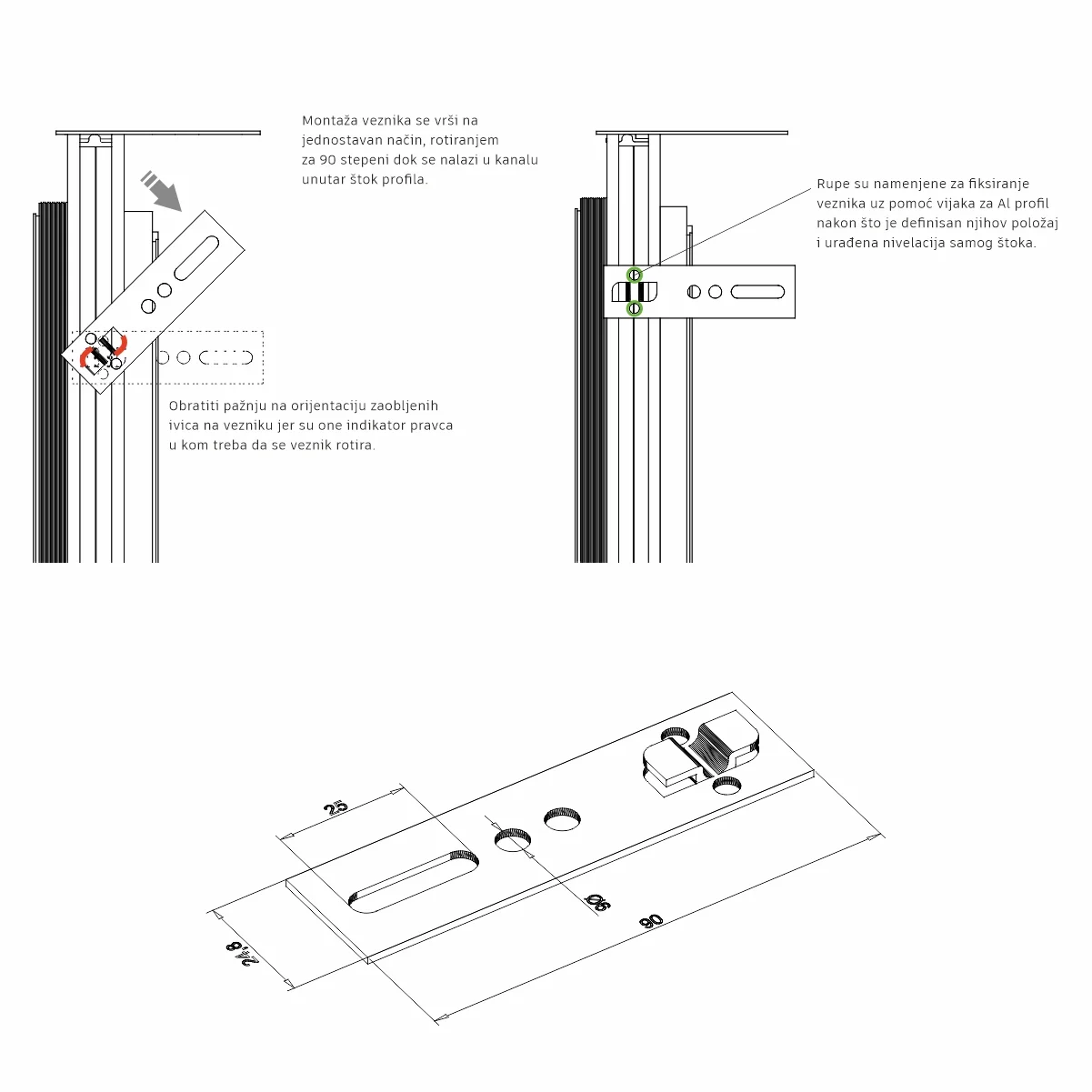 Montažna metalna žabica Koristi se za montažu skrivenog štoka, montira se u štok tako što se rotira za 90 stepeni unutar predvidjenog kanala u samom štok profilu. Takodje postoje i dve rupe predvidjene da se učvrsti vijcima za Al štok i sa druge strane za zid na koji se štok profil postavlja. Preporuka je da se za jedan štok koristi 8 komada. Po tri komada na vertikale štoka i dve žabice na horizontalu ukoliko postoji. Materijal: Čelik * Cena se odnosi na komad artikla
