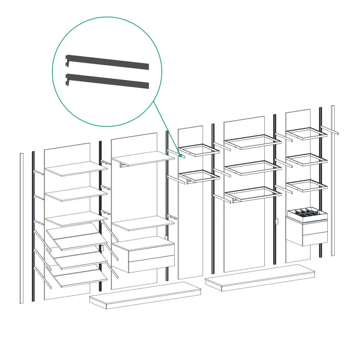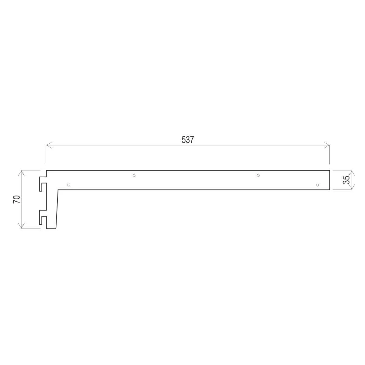 WI BD nosači za drvene/ staklene police - Ravni bočni Nosači se koriste za montiranje drvenih ili staklenih polica u Al ramu prilikom izrade otvorenih garderobera. Montiraju se na vertikani profil koji je postavljen na zid, jednostanim "klikom". Dolaze u paru, a završna obrada je antracit siva plastifikacija. Dužina nosača je 537mm, visina je 35mm.