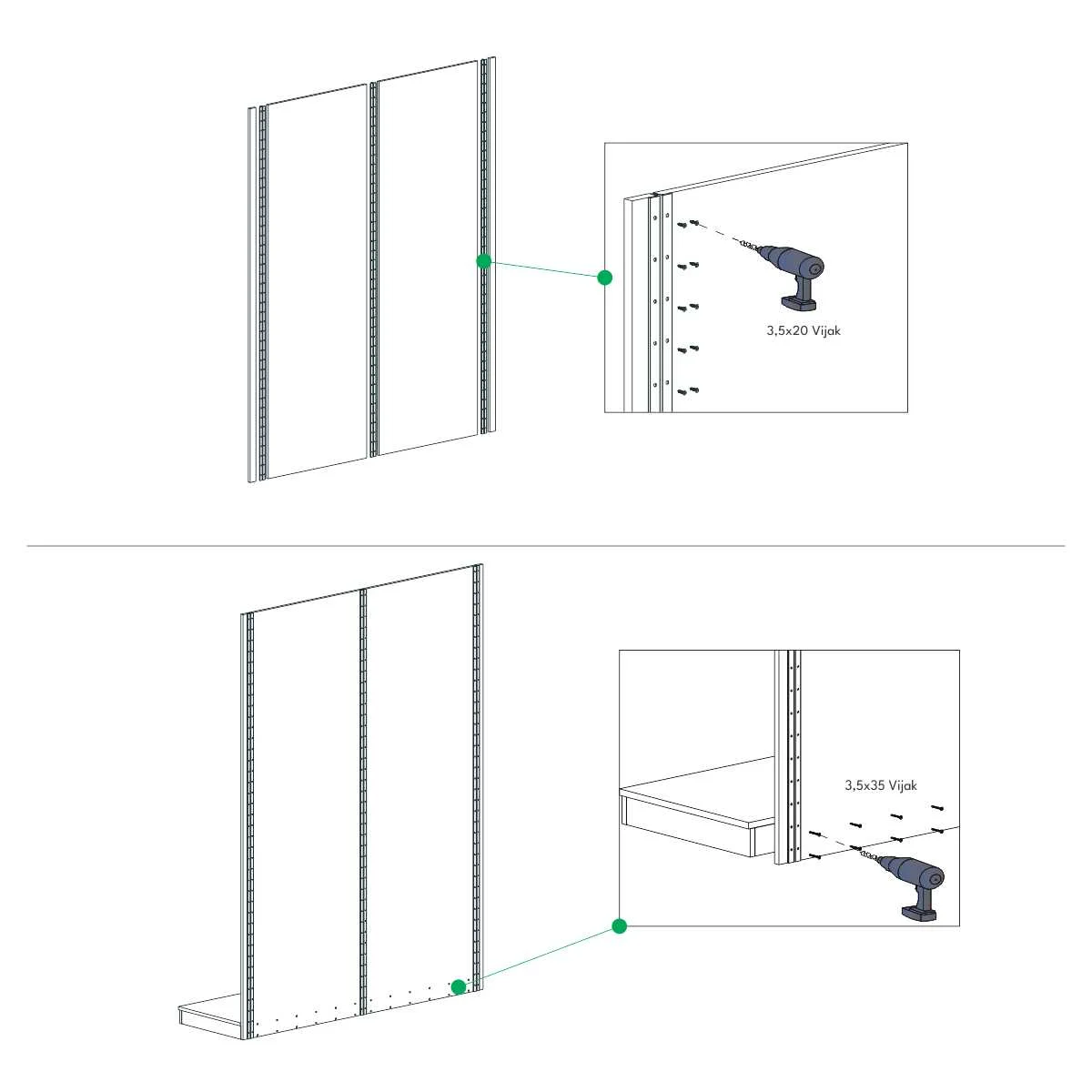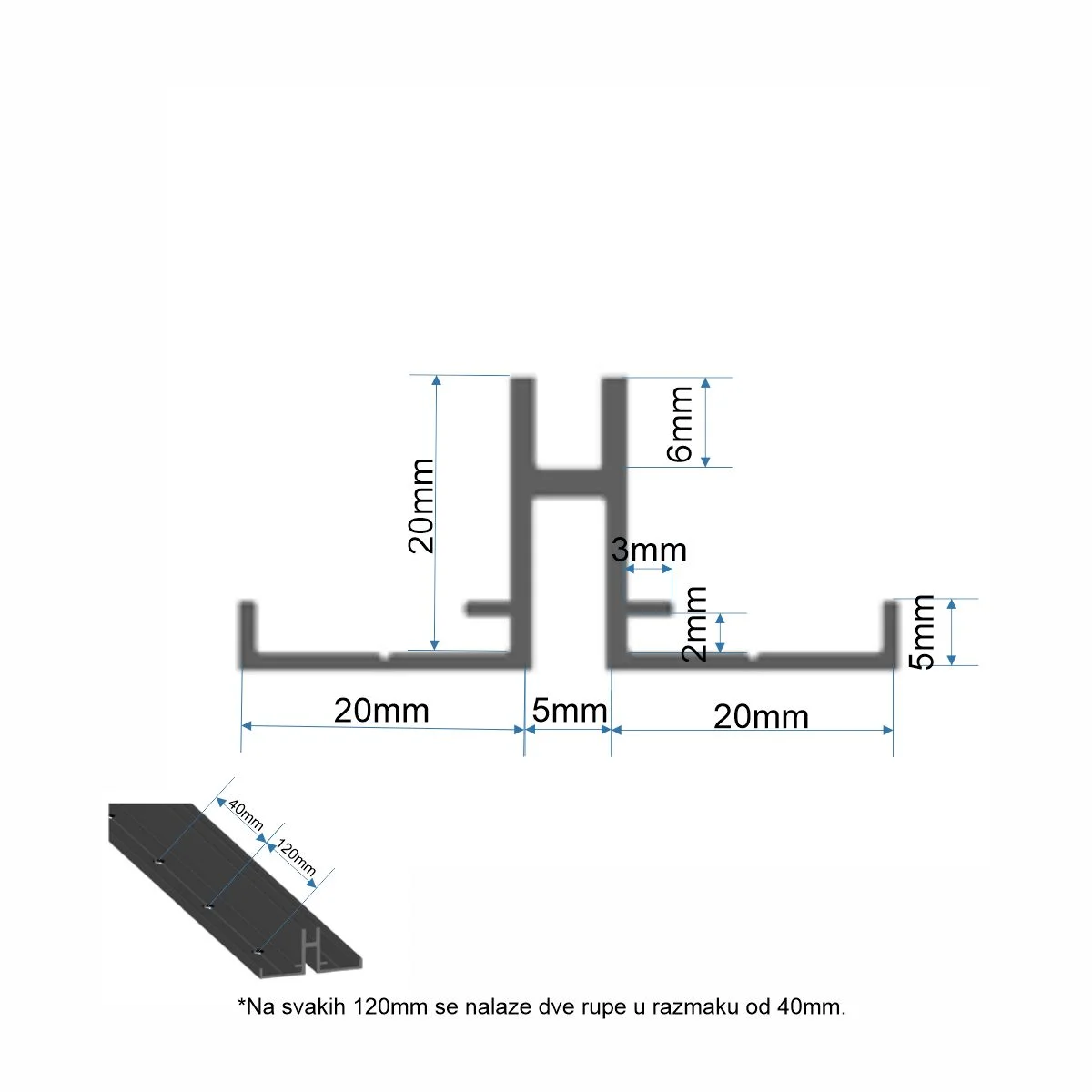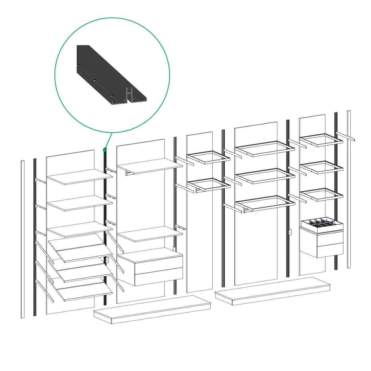 Vertikalni profil za izradu otvorenih garderobera Profil se koristi kao bazni vertikalni profil na koji se montiraju dodatni elementi za izradu otvorenih garderobera poput korpusa, drvenih i staklenih polica i vertikalnih panela (ledja) garderobera. Materijal: Aluminijum Završna obrada: Antracit siva Dužina profila je 2,80m.